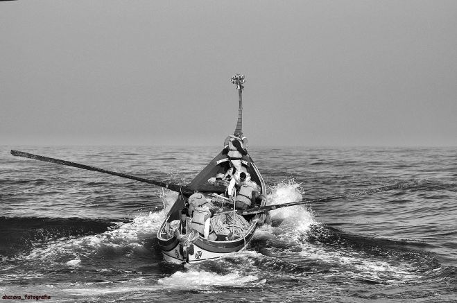 vê-se à ré, a estibordo, o reçoeiro a sair do barco, agora será a sorte a decidir se as redes virão cheias de peixe ou de muita pouca coisa.